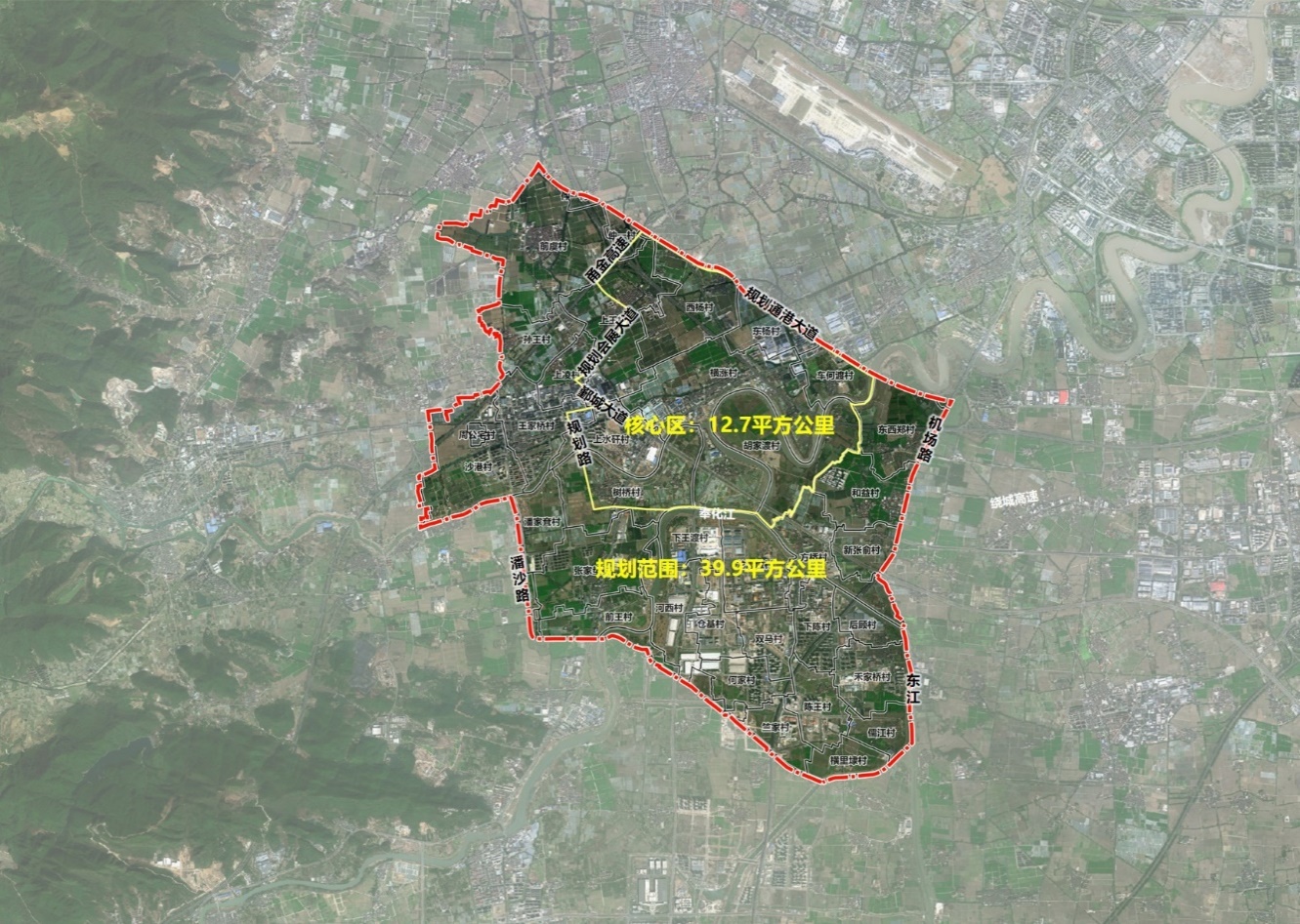 規劃範圍東至機場路、東江,南至方橋高壓走廊,西至前虞村、孫王村、王家橋村、沙港村村界、潘沙路,北至規劃通港大道,用地面積約39.9平方公里。核心區城市設計範圍東至車何渡村、胡家渡村界,南至奉化江,西至規劃會展大道、甬金高速,北至規劃通港大道,用地面積約12.7平方公里。