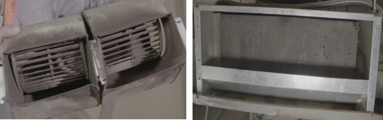 传统风机盘管⼀般情况下是隐蔽式安装工程吊装在天花板顶部,并且是封闭式机箱。无法实时观察到机箱内部被污染和堵塞的情况。遗留下我们看不见的重重隐患。