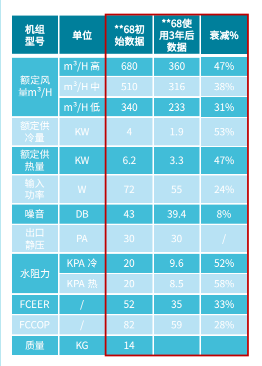 传统风机盘管使用3年后各项功效衰减逾⼀半