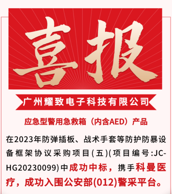 2024年1月29日,公安部警用装备采购中心(012)公布了“公安部警用装备采购中心2023年防弹插板、战术手套等防护防暴设备框架协议采购项目(五)入围结果公告”,并向广州耀致电子科技有限公司发布通知函,其应急型警用急救箱(内含AED)产品成功入围012公安部,将被全国各地公安部落地使用。广州耀致电子科技有限公司携手科曼医疗,将科曼AED大力推广,以高品质应急型警用急救箱(内含AED)助力公安部门完善国内各大场所应急配置。
