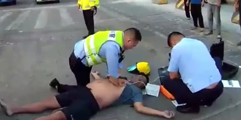 生死关头,倪晓明一刻也不敢延误,立即对男子采取心肺复苏。就在同时,江门市公安局交警支队蓬江大队七中队指导员方建鑫携带科曼除颤器(AED)赶到现场,迅速取出AED设备,电击、心肺复苏轮番上阵,两人联手展开一场与时间赛跑的生死救援。