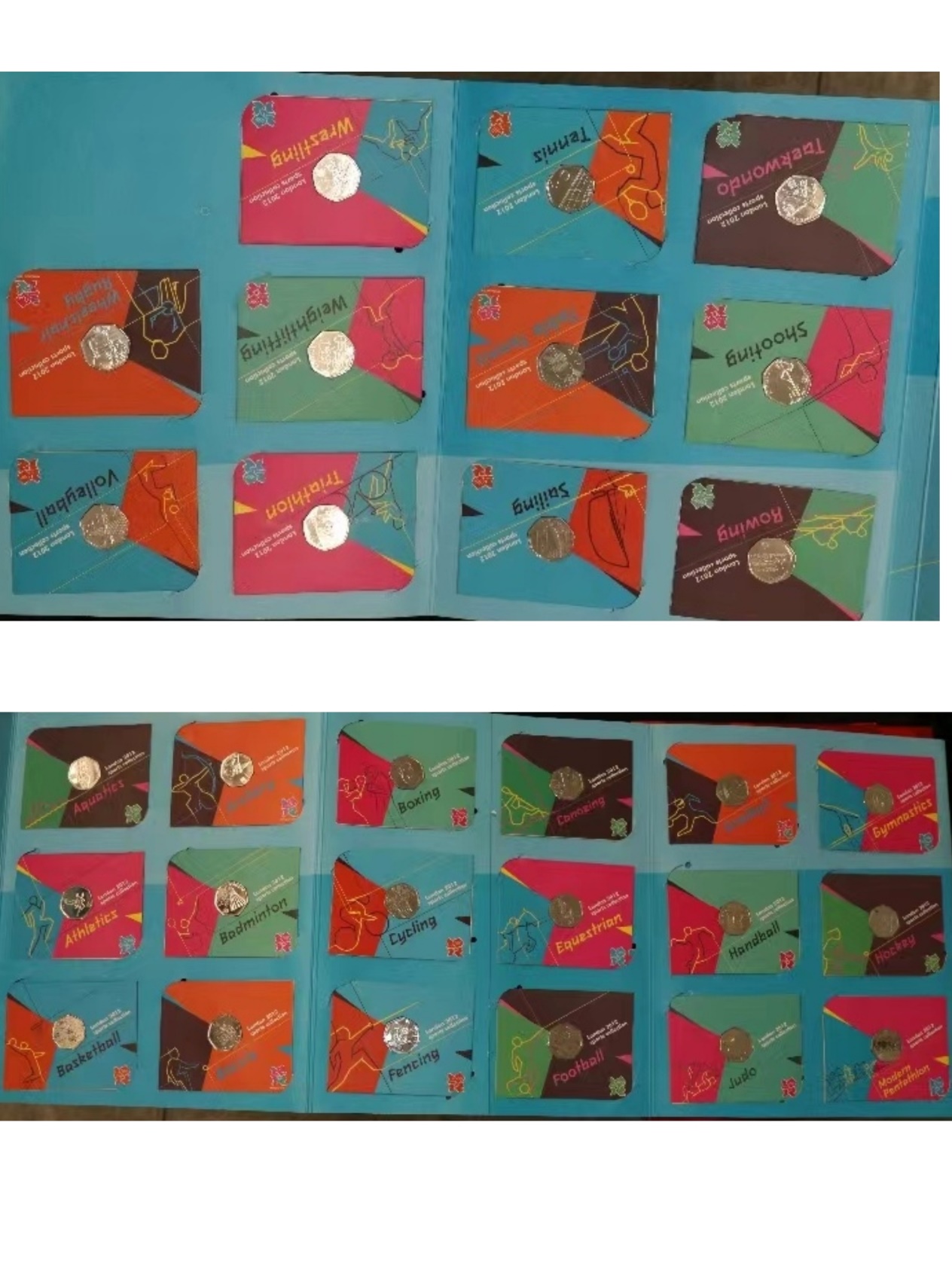 2012年伦敦奥运会纪念币。为英国法定货币,由英国皇家造币厂铸造发行,币共四枚正面图案:反映运动员、闻名的建筑等装饰组合设计。四个纪念币,重量28.28克,直径38.61毫米圆形,面值5英镑设计发行。背面图案:英女王陛下的头像。