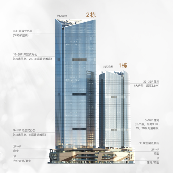 一大特点就是拥有 70年产权的住宅 产品,以地标综合体的理念去打造,区别于传统居住以功能性需求为主的定位,它更强调地标奢居与城市社交属性,以及对城市核心资源的奢侈性收藏。不是纯粹的住宅,而是由「超级地标综合体」赋能的住宅。