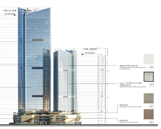 项目地处金融岛海岸线俱佳观海位,在总平面整体规划策略上,充分挖掘地块的价值,设计将两栋塔楼进行巧妙定位及造型推敲: