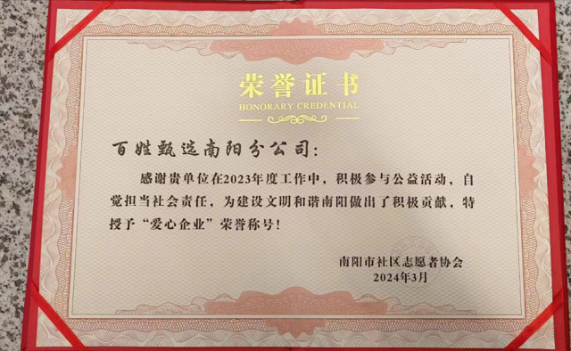 随着时代的进步,社会的发展,越来越多的良心企业关注到社会公益与责任感之中!此次会议上对于百姓甄选南阳分公司提出了表彰与肯定!对于百姓甄选南阳分公司一直以来所从事的爱心公益事业给予了肯定与支持,以及对百姓甄选企业为南阳市带来的经济效益与发展提出了表彰!颁发了荣誉证书!同时百姓甄选南阳分公司负责人柳向东也做出了表率,将继续在接下来的发展中做到不忘初心,热身公益,为当地带来更好的宣传与贡献!
