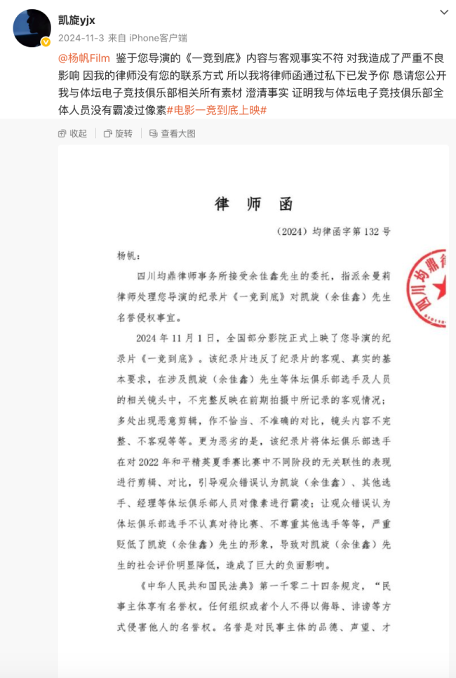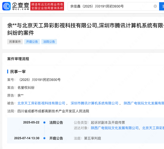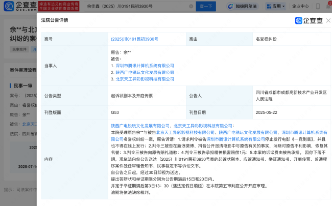 5月22日,法院刊登中国职业和平精英电竞选手余佳鑫(游戏ID凯旋),与北京天工异彩影视科技有限公司等名誉权纠纷开庭传票。企查查APP显示,余佳鑫诉求:判令停止发行电影《一竞到底》,并且也不得在线上发行;三被告在多平台公开澄清电影中与原告有关的事实,消除对原告不利影响,恢复其名誉;判令三被告向原告赔礼道歉并承担精神损害赔偿1元等。据悉,原告曾公开发布对《一竞到底》导演律师函,称“通过恶意剪辑,引导观众错误认为凯旋(余佳鑫)、其他选手、经理等体坛俱乐部人员对像素进行霸凌;让观众错误认为体坛俱乐部选手不认真对待比赛、不尊重其他选手等等”。公开信息显示,《一竞到底》是一部以PEL和平精英职业联赛为背景,和平精英品牌代言人华晨宇全程配音的中国首部电竞主题纪录片电影。