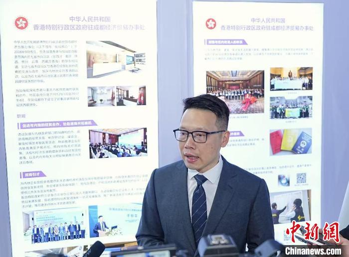 香港驻成都办主任袁嘉诺在西博会现场接受媒体采访。香港驻成都办 供图