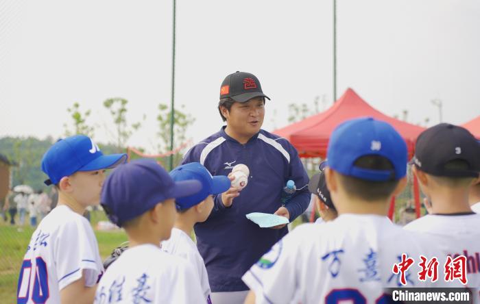 5月25日,在江西省南昌市的棒球场上,台青吴军平正在训练球员。吴敏 摄