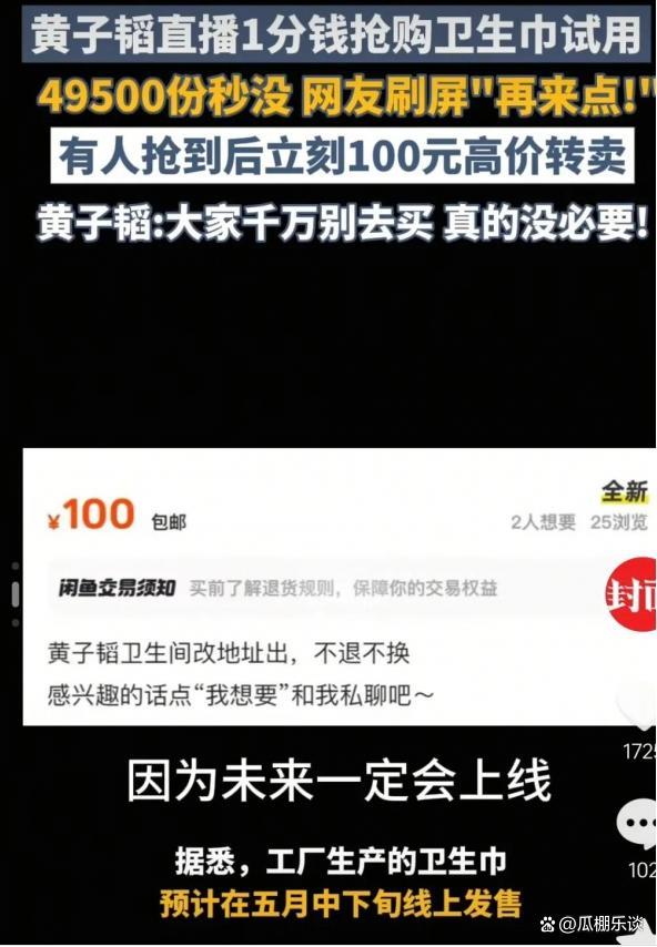 4月11日,黄子韬直播间搞了个“1分钱试用装”活动,瞬间秒光4.95万单。没想到5月18日正式开卖时,62片组合装定价49.8元(每片不到1块钱),网友们疯狂下单。首销15分钟卖出19.5万单,半小时破45万件,销售额冲到4000万,比演唱会门票还抢手。然而,限量供应导致黄牛疯狂扫货,原价49.8元的套装在二手平台被炒到55元到190元,溢价近4倍。有网友吐槽:“买卫生巾比抢茅台还难!”