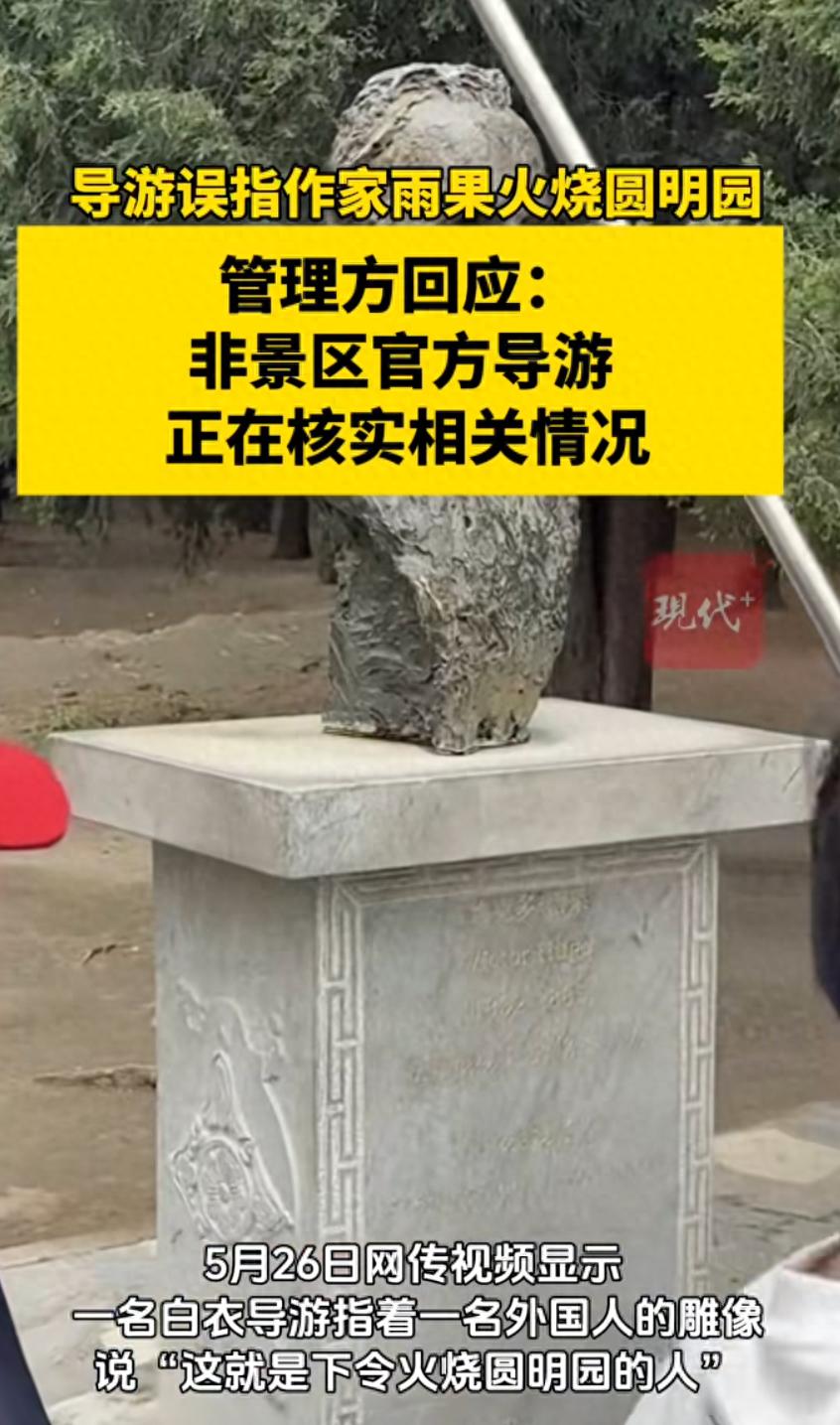 导游称雨果下令烧圆明园 园方回应。5月26日,一段导游讲解的视频引发网友热议。视频中,一名身穿白色上衣的导游指着一名外国人的雕像,向游客介绍:“这就是下令火烧圆明园的人。”网友质疑:这明明是法国作家雨果,怎么成了下令火烧圆明园的人?