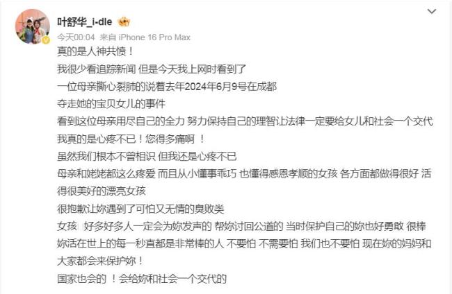 28日凌晨,女团i-dle成员叶舒华时隔一年更新微博,为成都女子家门口被害案受害者发声。她表示:“我用我公众人物的身份来和大家说请重视这个事件,因为我知道此时此刻,某个地方,也有可能会有下个受害者,或是已经正在遭遇同件痛苦的悲剧正在重演。有病的人需要保护,没病的人没理由要牺牲。真的不要再拿自己精神不正常这说词来当免死金牌。”叶舒华还提到,看到这位母亲用尽自己的全力,努力保持自己的理智让法律一定要给女儿和社会一个交代,这令她心疼不已。
