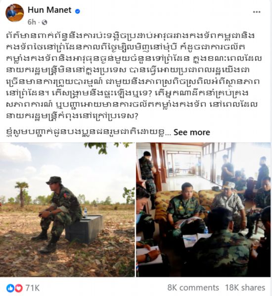 洪玛奈在社交媒体上发文说,“我希望柬泰两国陆军高层今天的会谈能够取得积极成果,一如既往地保持双方前线部队间的和平与良好沟通”。