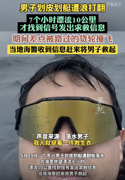 皮划艇被浪打翻男子海上漂流7小时 绝望漂流终获救!5月29日,广东一名男子分享了自己在庙湾岛附近划皮划艇时遭遇的惊险经历。他在海上遇到了测浪船被打翻的情况,手机没有信号且大船无法看到他。在这段时间里,他还差点撞上了一艘货轮,在海中绝望地漂流了七个小时,漂流了大约10公里后才找到信号发出求救信息。最终,当地海警等部门经过一个多小时的搜寻,成功将该男子救起。