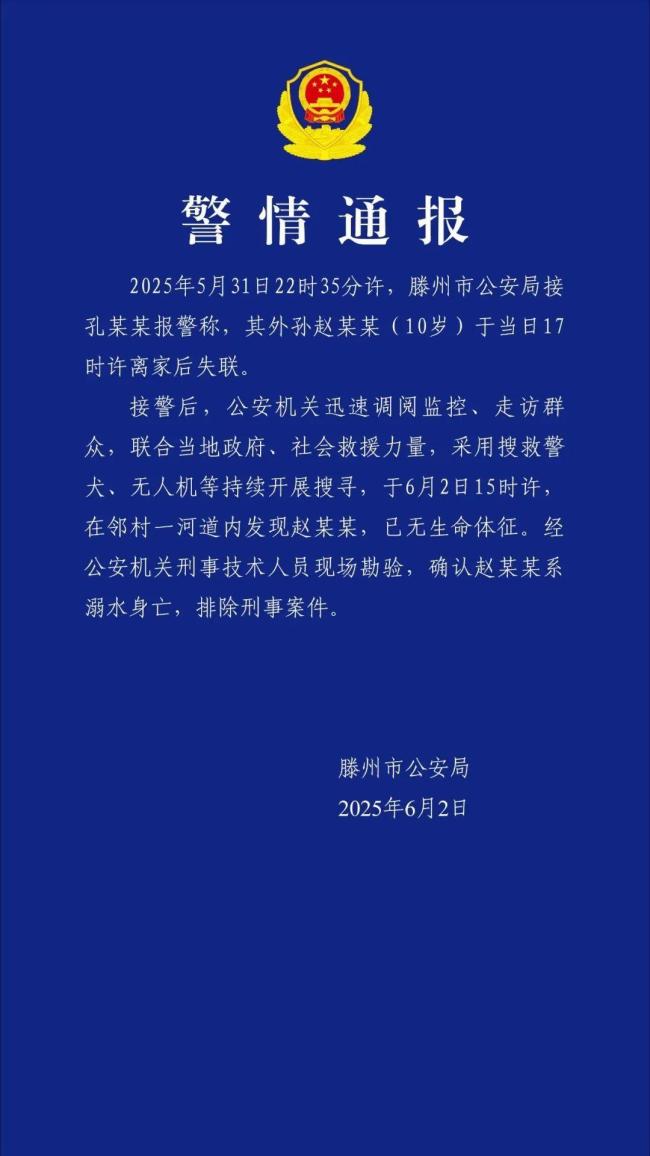 6月2日晚,山东省滕州市公安局发布警情通报。5月31日22时35分许,滕州市公安局接到孔某某报警,称其外孙赵某某(10岁)于当日17时许离家后失联。