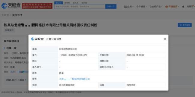 陈丽君新增名誉维权案件 网络侵权案将开庭!天眼查司法案件显示,近日,陈丽君与北京某网络技术有限公司相关网络侵权责任纠纷案件新增开庭公告,原告为陈丽君,该案件将于6月11日在杭州互联网法院开庭审理。