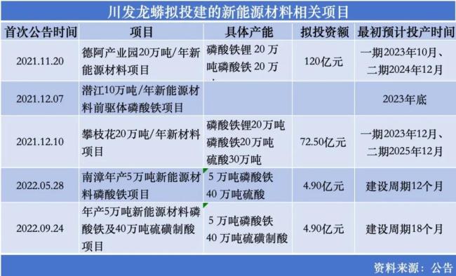 2022年5月,公司再公告,全资孙公司南漳龙蟒磷制品有限责任公司拟在襄阳循环经济产业园投资建设年产5万吨新能源材料磷酸铁项目,同时建设年产40万吨硫磺制酸;同年9月,全资子公司荆州川发龙蟒新材料有限公司拟在荆州投资4.9亿元建设年产5万吨新能源材料磷酸铁及40万吨硫磺制酸项目。