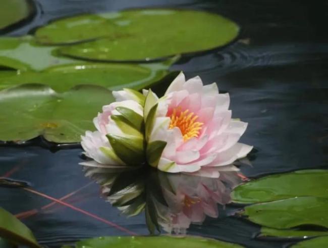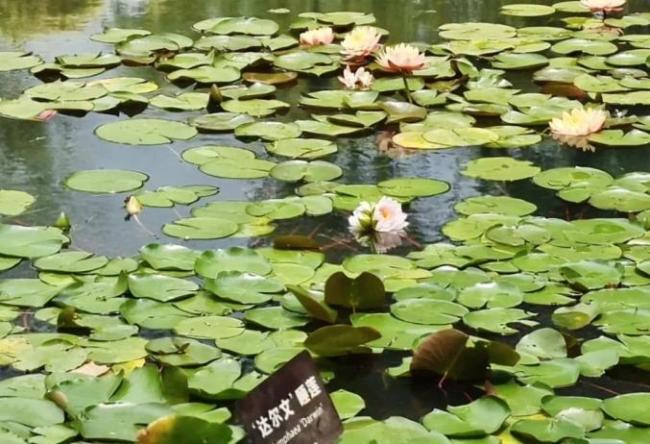 这株并蒂睡莲名为“达尔文”,是法国画家莫奈的一位好朋友于1909年利用来自非洲和亚洲的睡莲杂交培育出的新品种,后引入中国。达尔文睡莲叶纸质,正圆形,花粉白色,外层白色,内层粉红色,牡丹型,花朵浮水,雌雄蕊均为黄色。