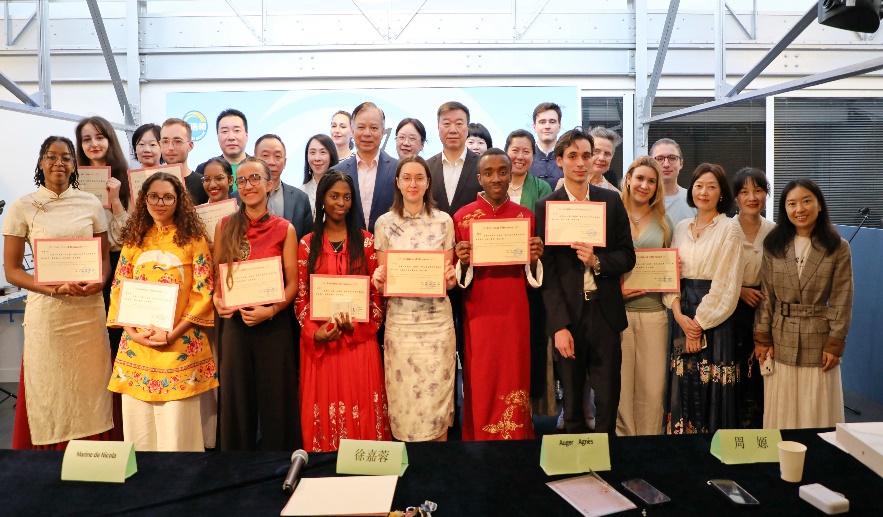 中国驻法使馆公使陈力、教育公参周家贵与获奖师生亲切合影。巴黎西岱大学孔子学院供图