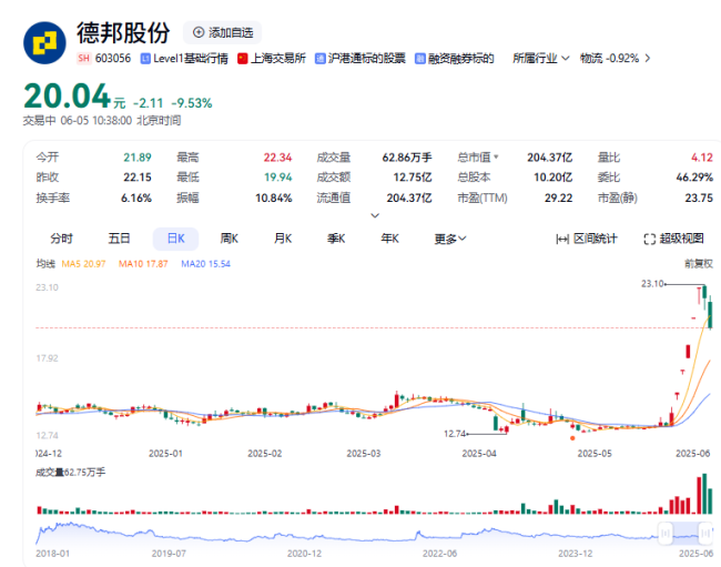 近期,德邦股份成为了A股市场的“当红炸子鸡”。5月27日至6月3日期间,该股一度实现“五连板”,股价也刷新自2023年2月以来的新高。