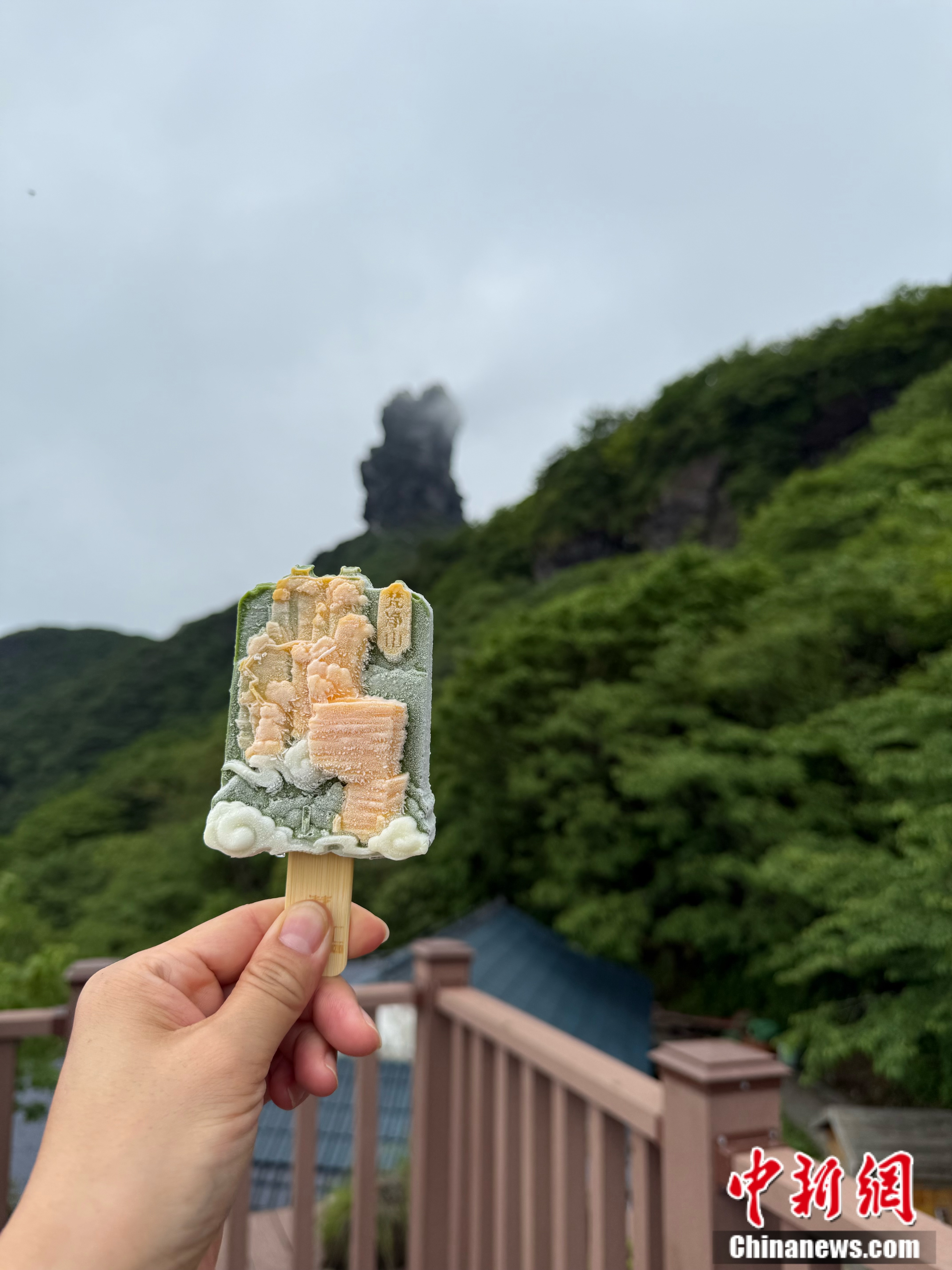 游客手持梵净山文创雪糕与红云金顶合照。中新网记者 王诗尧 摄