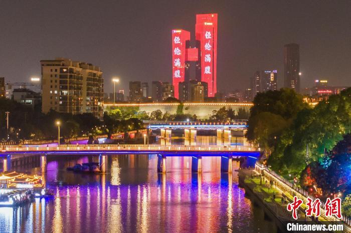 6月8日晚,江苏南京,楼宇上亮出“前程似锦”字样。(无人机照片)中新社记者 泱波 摄