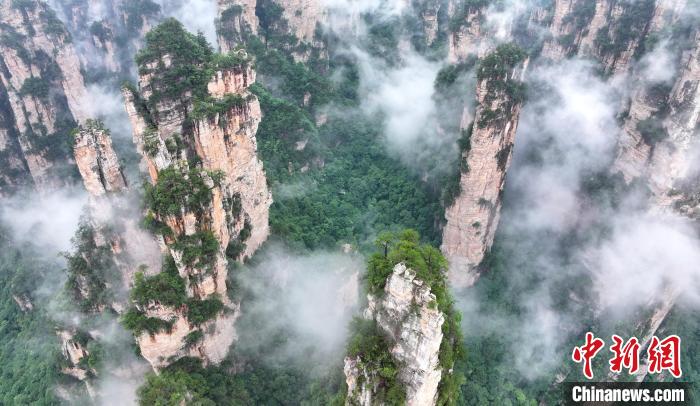 6月8日,湖南张家界国家森林公园百龙天梯、十里画廊出现雨后云海胜景,云雾在峰林间变幻飘逸,宛如水墨画境。吴勇兵 摄