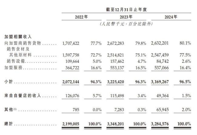 根据招股书,沪上阿姨来自加盟商的收入占比极高,且比例还在上升。2022年至2024年,加盟相关收入分别为20.7亿元、32.3亿元和31.7亿元,占比分别为94.3%、96.3%和96.5%。这背后是门店的不断扩张,截至2024年12月31日,沪上阿姨的门店总数为9176家,其中50.4%的门店位于三线及以下城市。而截至2025年4月18日,沪上阿姨门店网络进一步增至9367家门店,正不断逼近“万店目标”。