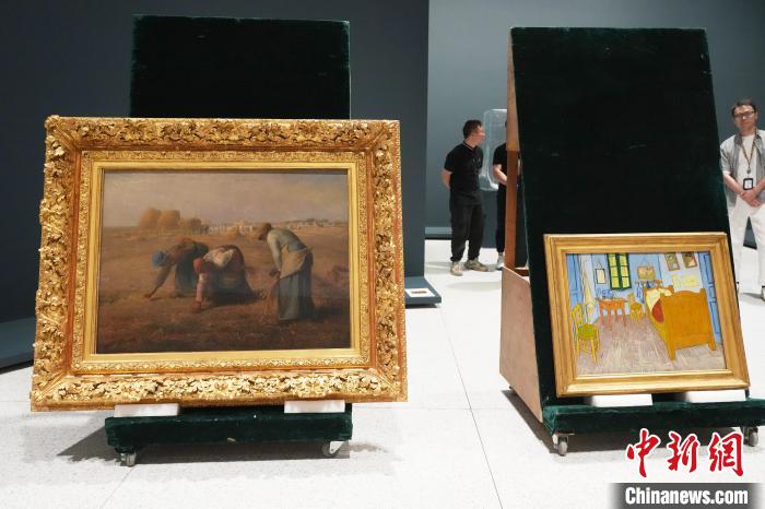 图为本次展览最重要的两件展品《拾穗者》(左)《梵高在阿尔勒的卧室》。中新社记者 张亨伟 摄