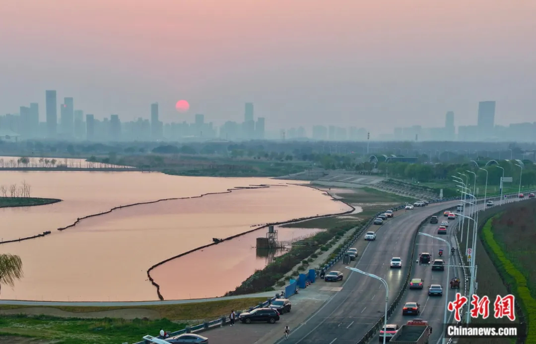 无人机拍摄的巢湖湿地落日景色。 中新社记者 张娅子 摄