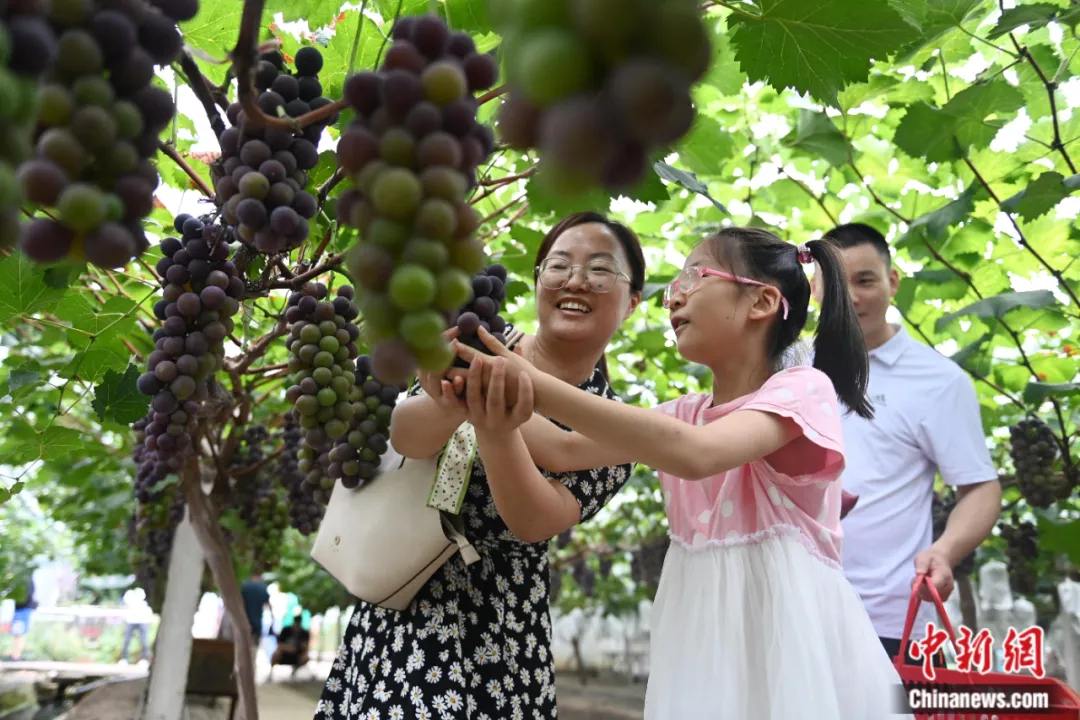 安徽省合肥市包河区大圩镇葡萄采摘园里,游客体验亲子采摘乐趣。中新社记者 韩苏原摄