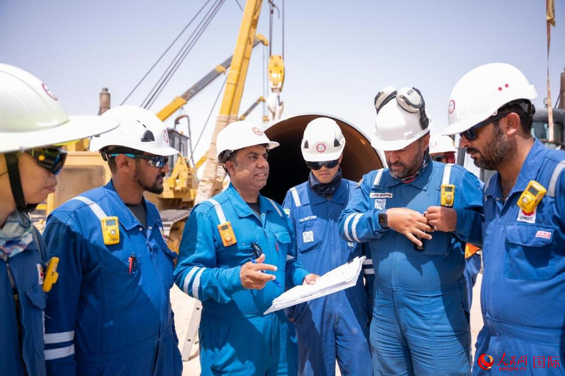 阿迪尔和中方工作人员研讨施工方案。中国石油工程建设有限公司海湾地区公司供图