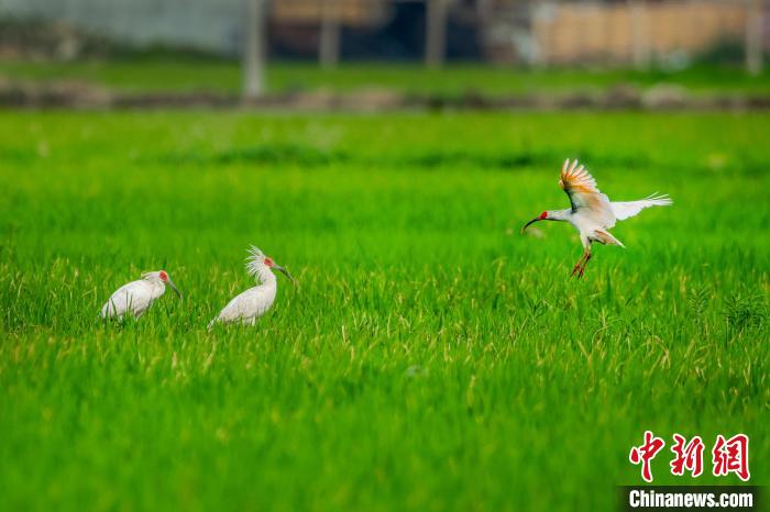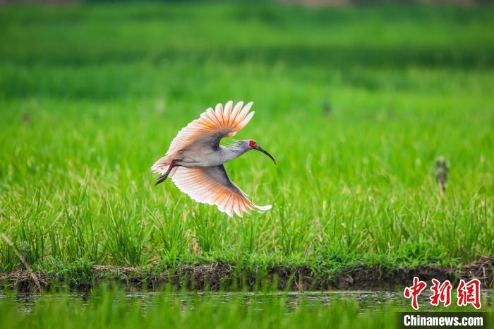 近日,位于秦巴腹地的陕西省汉中市城固县,水稻插秧工作已近尾声。朱鹮在稻田里飞舞嬉戏、展翅低飞、欢快觅食,构成一幅自然和谐的田园美景。图为朱鹮低飞在稻田上。 李吉安 摄