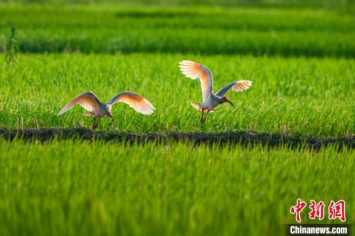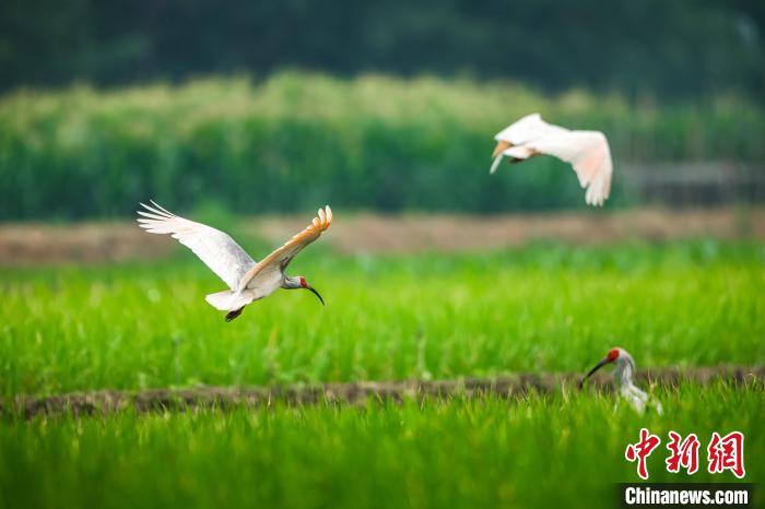 夏日秦巴腹地美如画 朱鹮在稻田里飞舞嬉戏