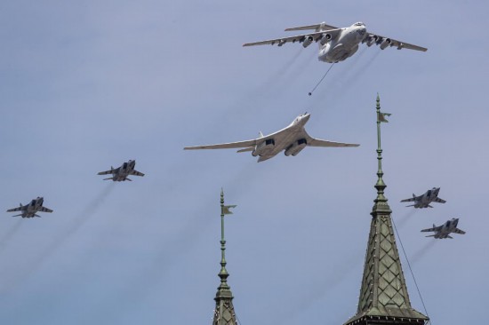 2022年5月7日,在俄罗斯首都莫斯科,米格-31战机、图-160战略轰炸机、伊尔-78空中加油机(从后至前)编队飞过红场上空。新华社记者白雪骐摄