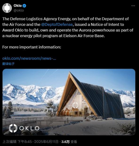 美国核能公司Oklo宣布被选为阿拉斯加艾尔森空军基地的潜在供电商。Oklo收到了美国国防后勤局能源部发出的“拟授标通知”,计划选定其Aurora发电站为空军设施提供电力。2021年就有媒体报道称,美国空军已选择艾尔森基地部署第一座微型核反应堆。Oklo在去年12月提交的最新10-K年报中也透露已被初步选中为该基地提供电力和热能。