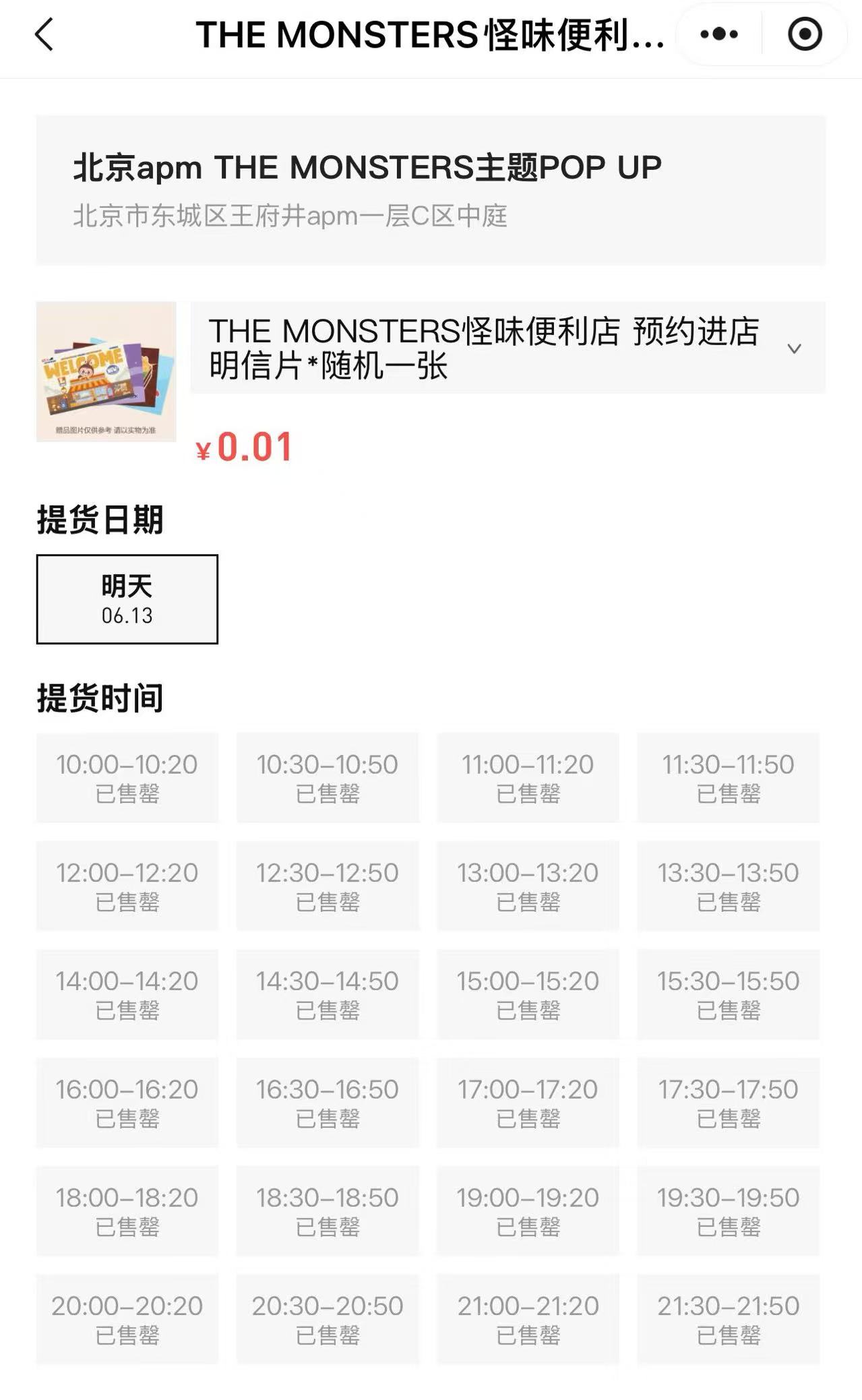 据泡泡玛特介绍,线下在快闪店购买产品,需提前预约并支付0.01元,以获得进店资格,暂不开放现场排队进店。预约时段及人数方面,每20分钟为一个时段,每个时段15人(实际可能根据场地管控进行调整),全天24个时段。进店顾客需要20分钟内完成选购并结账,每位预约成功并进店顾客仅限结账一次。6月12日起每天10:00起开放次日时段预约。