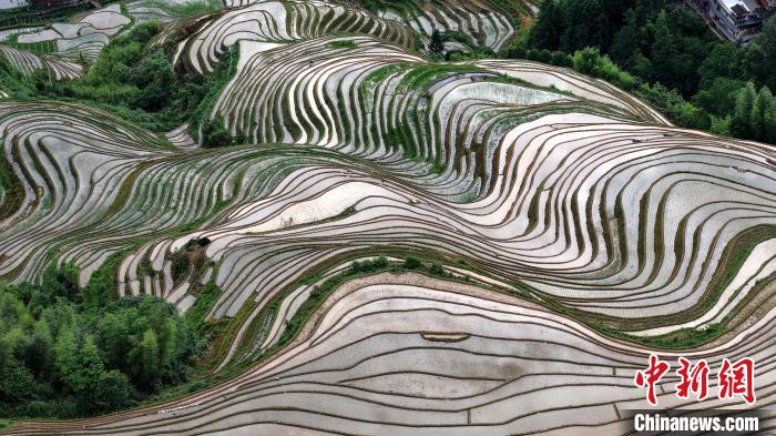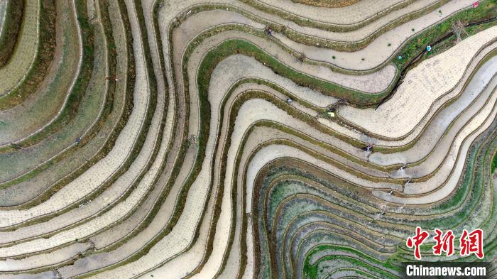 图为村民在梯田上劳作(无人机拍摄)。潘志祥 摄