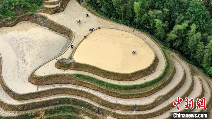 图为村民在梯田上劳作(无人机拍摄)。 潘志祥 摄
