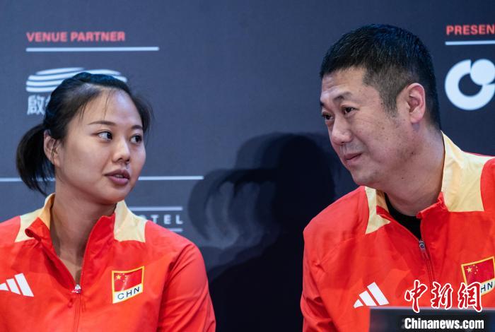 本站赛事将于6月18日至22日在全新的香港启德体育园启德体艺馆举行。图为中国女排主教练赵勇(右)和队长龚翔宇出席发布会。中新网记者 侯宇 摄
