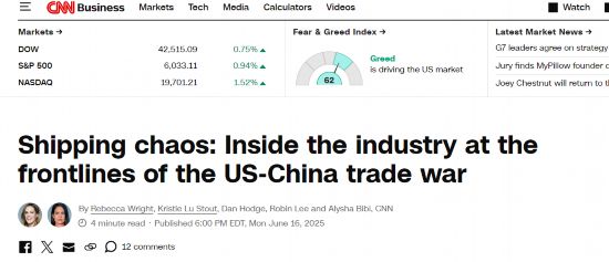中国日报网6月18日电 6月16日,美国有线电视新闻网(CNN)刊文聚焦贸易战对全球航运业造成的混乱与挑战。