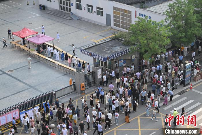 6月20日,山西省太原市第十五中学校,参加中考的考生排队等候进入考场。中新社记者 韦亮 摄