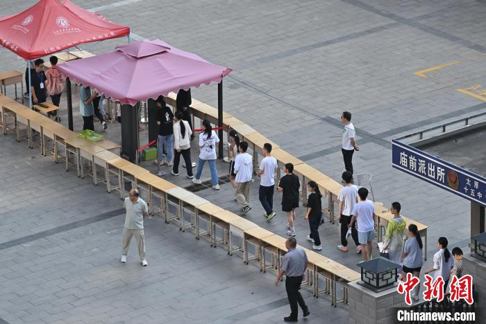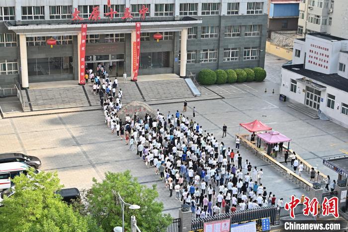 6月20日,山西省太原市第十五中学校,参加中考的考生排队进入考点。中新社记者 韦亮 摄