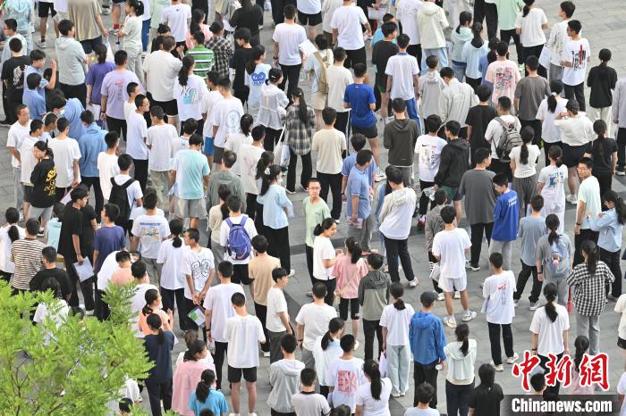 6月20日,山西省太原市第十五中学校,参加中考的考生排队进入考场。中新社记者 韦亮 摄