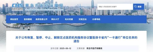 近日,山东青岛市医保局发布《关于公布恢复、暂停、中止、解除定点医药机构服务协议暨医保卡省内“一卡通行”单位名单的通告》。