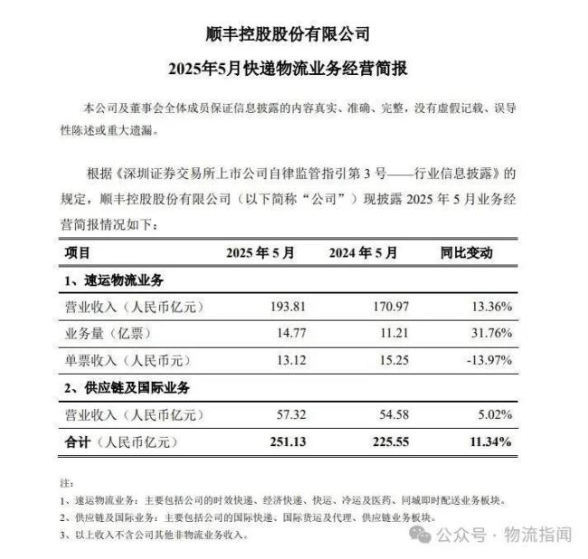 顺丰业务增速持续高于行业均值,5月份营收251.13亿元
