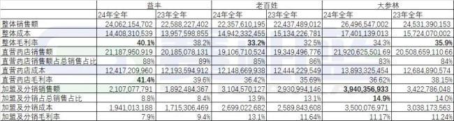 表1:2023-2024年三家公司整体、直营药店、加盟及分销数据对比