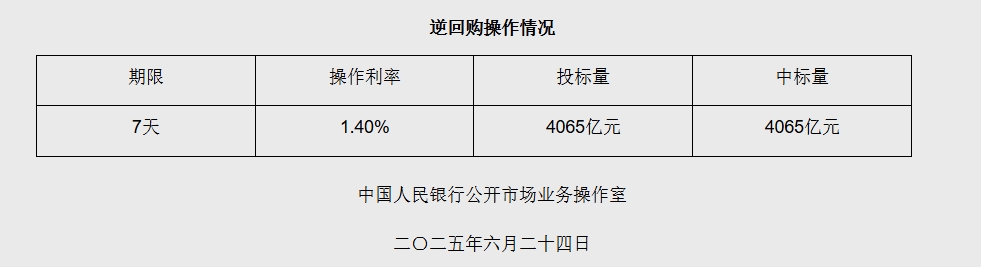 中新网6月24日电 据央行网站消息,2025年6月24日中国人民银行以固定利率、数量招标方式开展了4065亿元逆回购操作。具体情况如下: