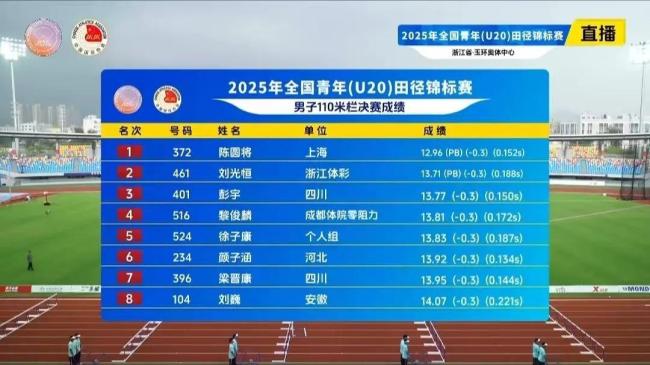 6月24日下午,在浙江台州举行的2025年全国青年(U20)田径锦标赛男子110米栏(99厘米)决赛中,上海选手陈圆将以12秒96的成绩夺得冠军,并打破了该项目的亚洲青年(U20)纪录。此前,该项目的亚洲纪录是日本名将泉谷骏介创下的13秒19。