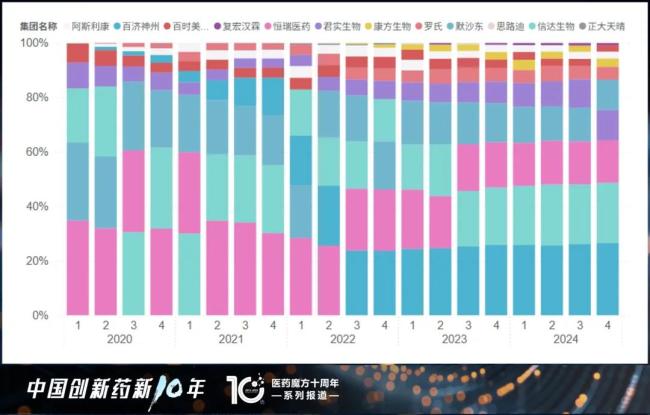 2020年至2024年PD-(L)1靶点中国院内市场份额变化情况(数据来源:医药魔方Pharma BI IPM数据库)