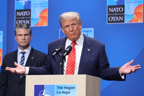 6月25日,在荷兰海牙,美国总统特朗普(前)在北约峰会后出席记者会。新华社记者赵丁喆摄